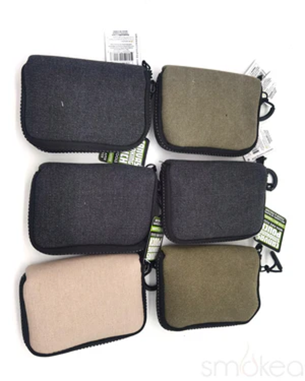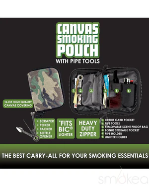 The Canvas Smoking Pouch from Smokezilla is the perfect on-the-go solution for storing small pipes, vaporizers, rolling papers, lighters and more. It features a high quality canvas construction and heavy duty zipper. Includes a multi-use pipe tool, credit card pocket, removable scent proof bag, pipe holder, lighter holder and bonus pocket.